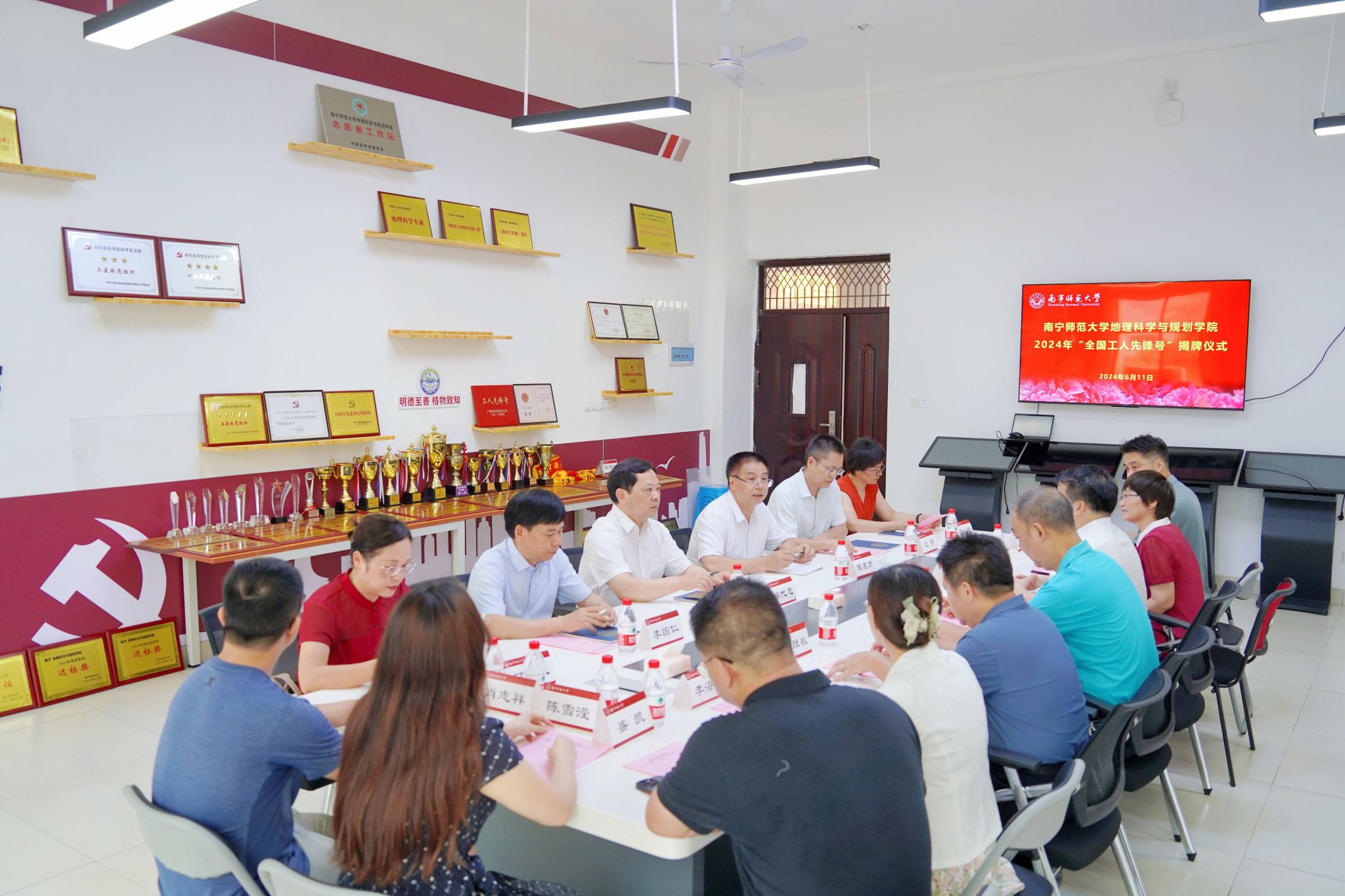 6月11日,学校在武鸣校区地源楼为中文成人网 荣获的2024年“全国工人先锋号”举行揭牌仪式。学校党委副书记、工会主席侯代忠,校工会、组织部、宣传部等部门负责人,中文成人网 领导班子成员及教师代表,地理与海洋研究院和环境与生命科学学院代表参加活动。