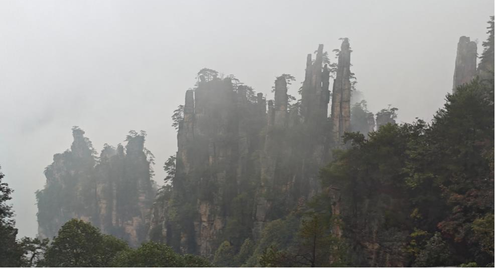 实习最后一天,我们来到了黄石寨。黄石寨位于张家界国家森林公园中部,为一方山台地,海拔1080米,西南稍高,东北略低,四周全是刀切绝壁,是俯视砂岩峰林景观的最佳观景台。沿寨环行,群峰皆立足下,远近诸般奇景尽收眼底,故有“不上黄石寨,枉到张家界”之说。