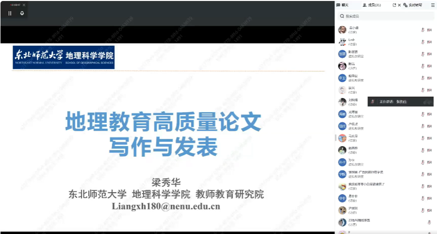 东北师范大学地理科学学院、教师教育研究院梁秀华老师以“地理教育高质量论文写作与发表”为主题开展专题讲座。梁秀华老师从论文写作的难点痛点出发,围绕高质量学术论文的核心要素、基本架构和发表策略三个方面,结合典型的教学研究论文案例展开了深入分析。她指出,高质量学术论文需具备“研究问题以小见大、论证过程科学严谨、结论可验证可推广”三大基本要素;在选题上要避免“假大空”和“模糊陈旧”,倡导“精小明确、新颖真实”,要体现创新性和时效性;在论文结构上,结合典型案例分析了学理分析型、教学反思型、文献综述型三类论文的写作思路和基本结构。另外,还就四层次文献阅读、“沙漏式”引言写作思路、论点论证的常见角度和思维方式以及摘要与关键词的写作技巧等进行了案例式分析。关于论文的发表,梁老师建议要研究期刊风格,强化术语规范和学术对话意识,通过持续修改提升论文质量。
