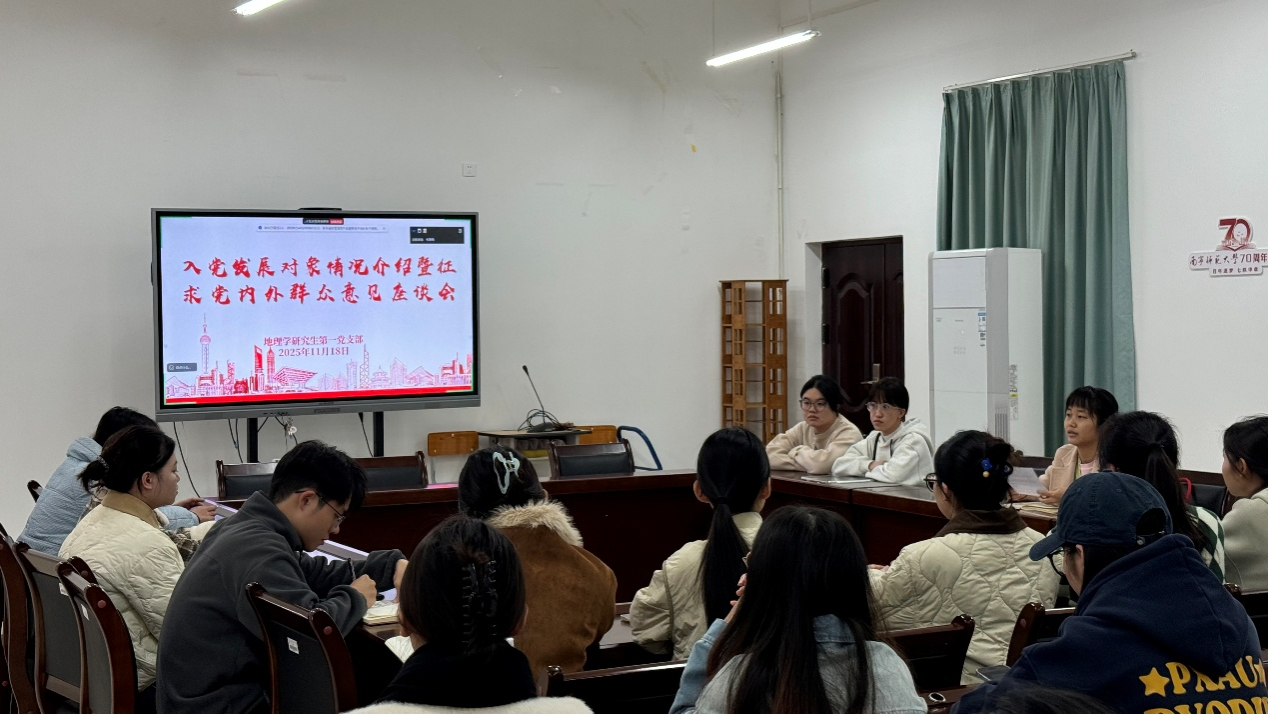 11月18日,中文成人网 地理学研究生第一党支部在武鸣校区地源楼C401室以线上线下相结合的形式,召开发展对象候选人党内外群众意见座谈会。会议由党支部书记韦萍萍主持,学院党委组织委员孔提英老师线上指导,党支部支委、党内外群众代表等共同参与。
