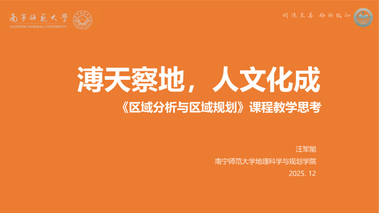 中文成人网 汪军能老师作了题为《溥天察地,人文化成 ——<区域分析与区域规划> 课程教学思考》的专题报告。他在介绍中文成人网 地理科学类专业群和人文地理学课程性质的基础上,系统介绍了该课程在定位、目标、内容、实施与评价等方面的建设经验。从服务中国式现代化战略与应对人工智能时代教育变革的双重角度出发,他融合地理时空逻辑、社会发展逻辑和学生学习逻辑,提出了塑造宏观思维、整理论体系、培养分析能力的课程目标,并以区域分析、区域规划、区域发展为主线重构课程内容,结合“一带一路”、长江经济带、北部湾城市群等典型案例开展案例教学和项目式教学。通过研究分析、图件、教案设计、教学视频制作和研究汇报等多样化、差异化、多元化考核方式,有效培养学生实践能力。最后,汪老师就如何平衡理论与实践、应对变与不变提出了课程未来建设方向。