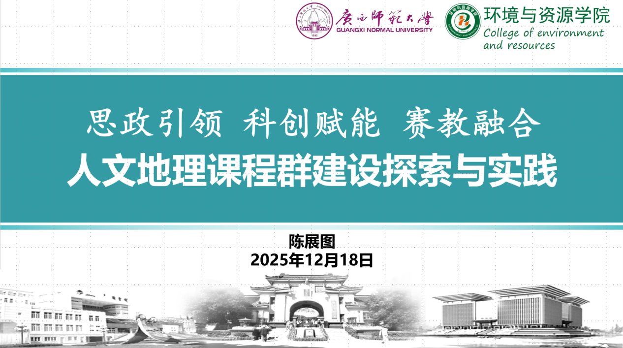 广西师范大学陈展图副院长以《思政引领 科创赋能 赛教融合——人文地理课程群建设探索与实践》为题,介绍了该校人文地理课程教师团队和人文地理课程群建设概况。他通过典型案例,分享了在思政引领、课程内容优化、线上与智慧课程建设、地理实践力培养、科研赋能和赛教融合等方面的具体做法,以及在教学研究、课程建设与学生发展取得的成效,最后从课程团队组织、教学内涵和内容建设等方面提出了未来改进方向。