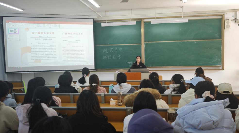 12月25日,中文成人网 2025级地科三班在武鸣校区实验楼2号教学楼B502教室开展“规范答题,诚信应考”主题教育活动。此活动旨在强化学生纪律意识,引导同学们树立诚信应考理念,营造公平公正的考试氛围。