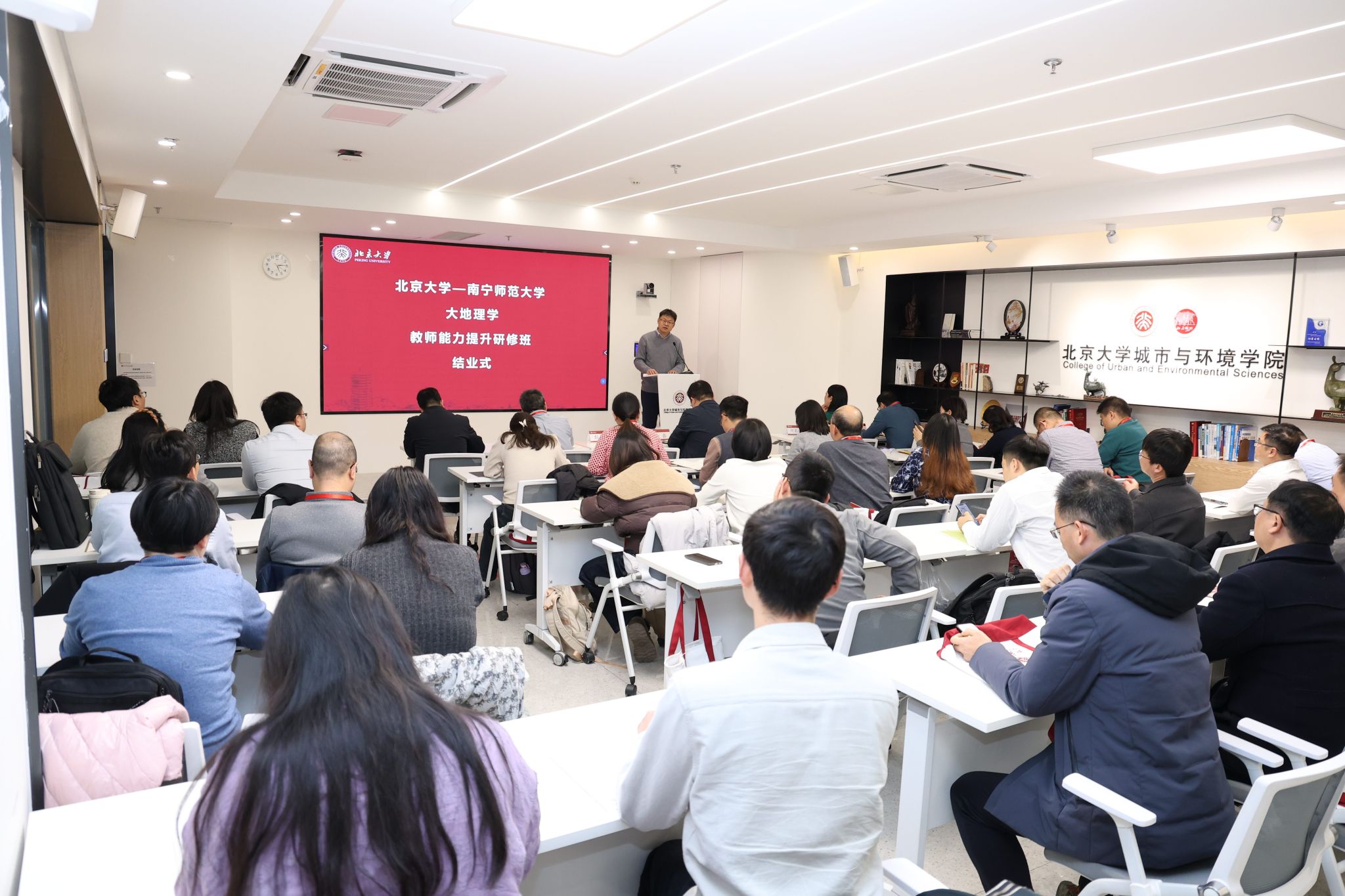 1月23日下午,研修班举行了简朴而庄重的结业式,为期五天的学习圆满落幕。结业仪式上,北京大学城市与环境学院党委书记、院长彭建教授出席并致辞,我校地学部教师代表秦年秀、孙建飞、黄富、陆汝成四位老师依次分享了学习体会与收获。