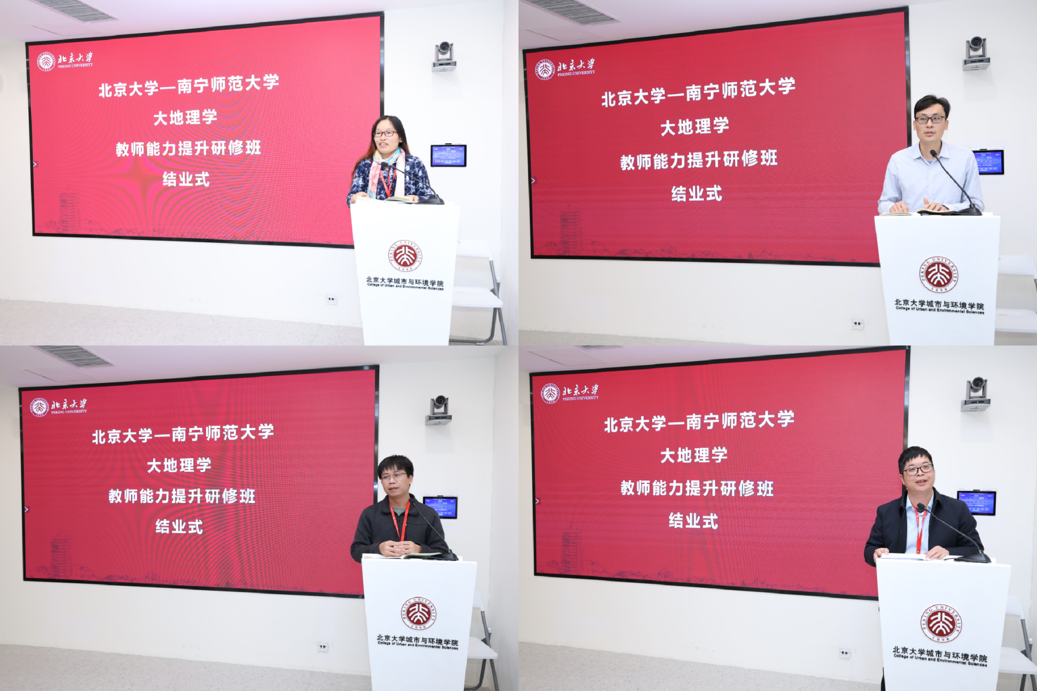 在随后的学习感言环节,我校地学部的四位教师代表结合自身研修体会,分享了丰富而深刻的学习感悟。秦年秀老师表示,此次研修不仅系统更新了学科知识体系,更深入理解了地理学在回应国家战略与全球议题中的责任与使命;孙建飞老师谈到,从学科发展史到科研方法论,从教学创新到技术融合,课程设计既具思想深度又贴近教学实际,为日后课堂改革与科研选题带来重要启发;黄富老师重点提到人工智能与地理学结合的讲座令人印象深刻,拓展了其对交叉学科研究与教学的视野;陆汝成老师则总结道,此次研修是一次“从理念到方法、从理论到实践”的全方位赋能,未来将努力把前沿思维与实践经验转化为教学与科研的具体行动。