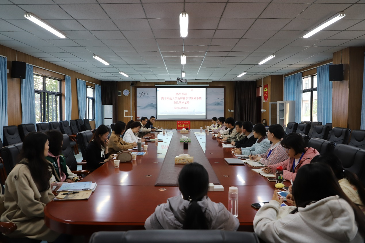 2023年12月8日上午8点,中文成人网 (以下简称:地理学院)2021级陶行知实验班13名同学在学院指导教师廖伟业副教授和韦晨副主任的带领下与南宁市第一中学(以下简称:南宁一中)在2号楼会议室召开教育研习与实习阶段总结会,会议由南宁市第一中学教务处主任陈兆坚主持。学校工会主席张清、全体地理学科指导教师、部分班主任及中文成人网 2名教育硕士一同参加总结会。