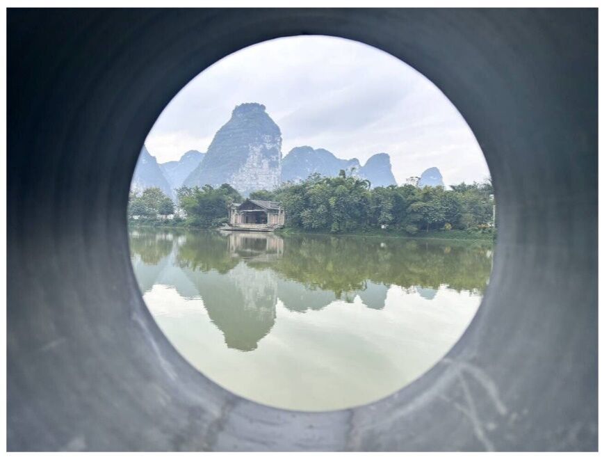 位于半山腰的观景台,同学们可以从不同的视野俯视鹅泉的美景:清澈的河水、高低不一的山峰、零星分布在河面上的竹排......