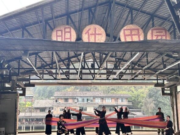 而在明仕田园的民族歌舞表演中,我们可以看到崇左市大新县的民族服饰色调以黑色为主,用蓝靛染制而成,因此他们被人们称为“黑衣壮”,又被誉为壮族传统文化的“活化石“。