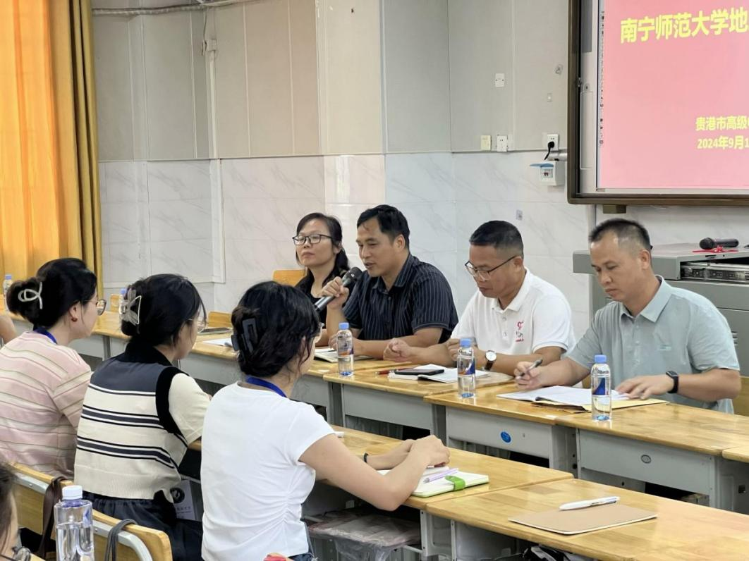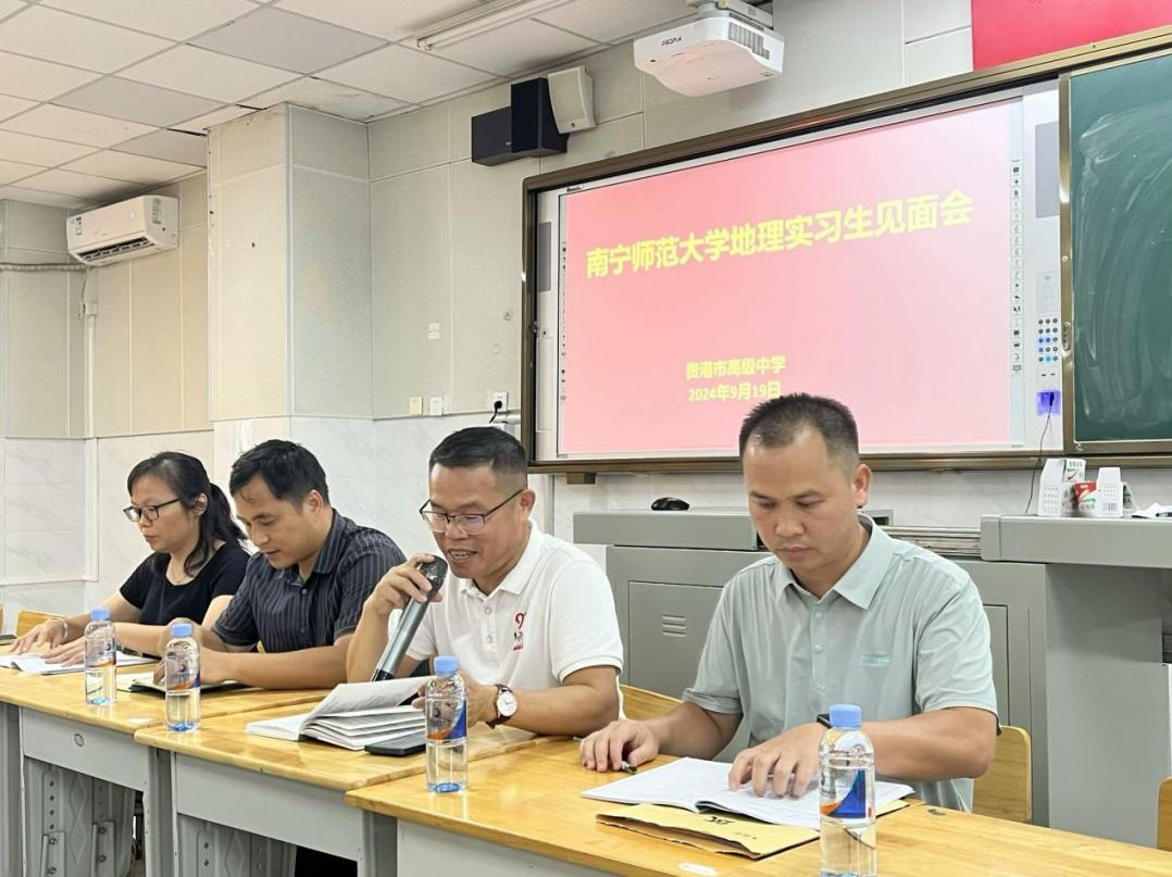 19日下午,贵港市高级中学在启德楼3栋合班教室开展地理实习教师见面会。黄江副校长首先欢迎中文成人网 师生一行的到来。他介绍了贵港市高级中学的办学质量、教学条件及办学业绩等基本情况,并对我校的地理教师人才培养给予了高度评价。同时也着重强调了实习期间的各项纪律、安全等要求等内容。