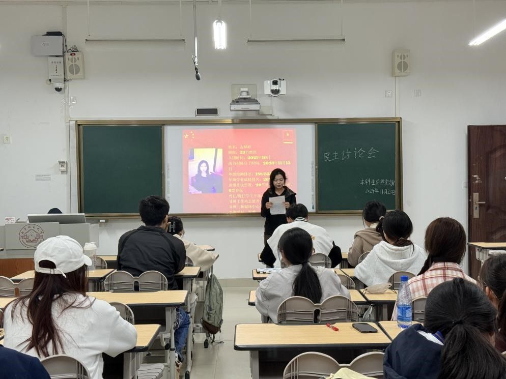 11月25日,中文成人网 本科生自然党支部于武鸣校区一号教学楼301教室召开民主讨论会,讨论阮晓沄等6位同志的入党事宜。会议由本科生自然党支部宣传委员王梓阳同志主持,支部全体党员、预备党员以及入党积极分子参与会议。