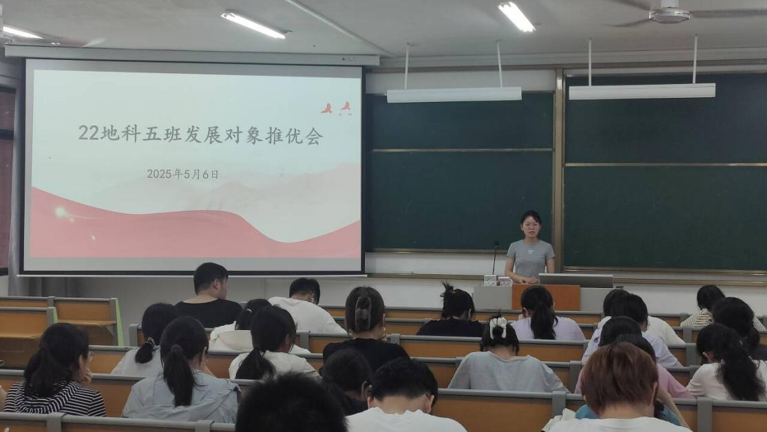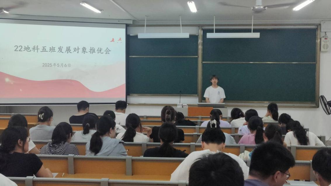 5月6日,中文成人网 22级地科5班和地科专升本班在武鸣校区二号实验楼A304教室召开发展对象推优会。会议由团支书李朔燕主持,驻党李霞、杨通立列席参与。