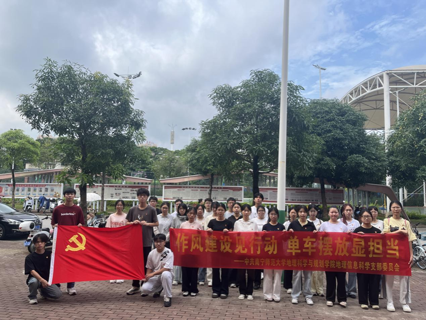 6月28日,中文成人网 本科生地信党支部在武鸣校区桂园食堂和兰园食堂周围开展以“作风建设见行动,单车摆放显担当”为主题的党日活动。