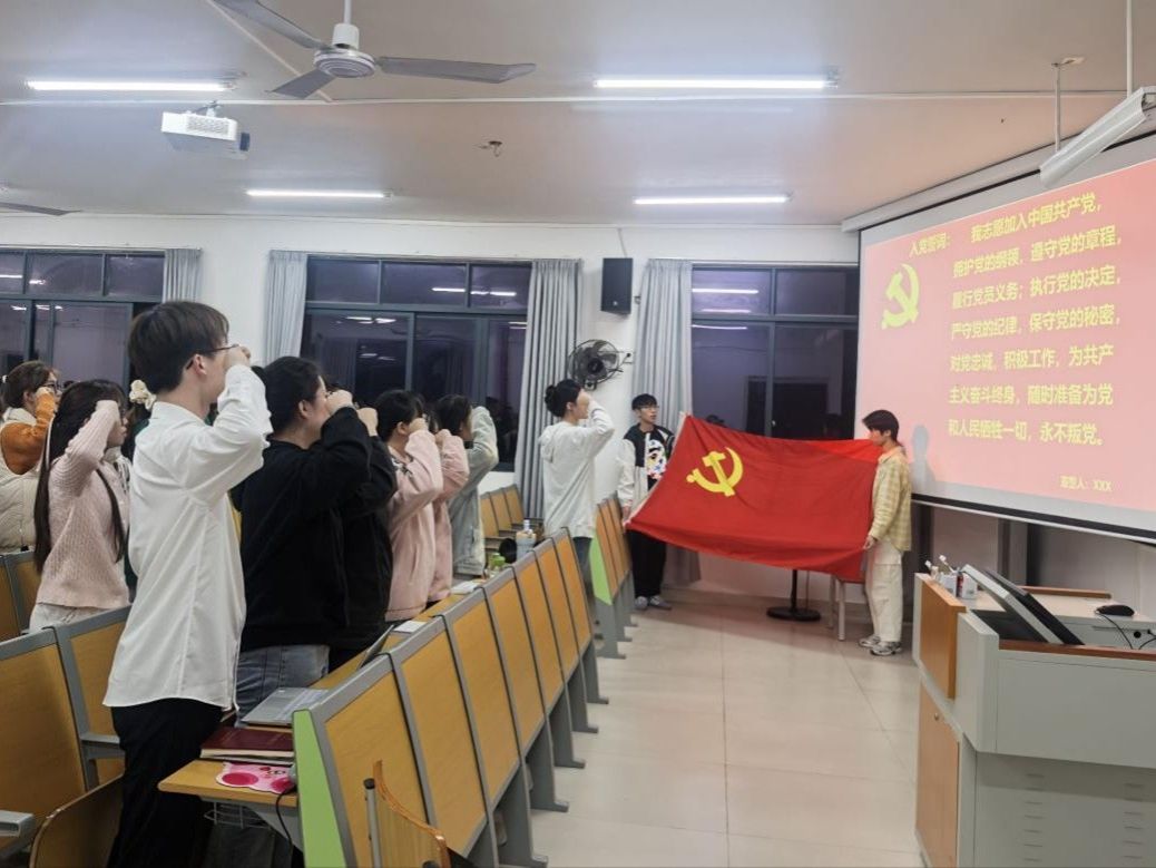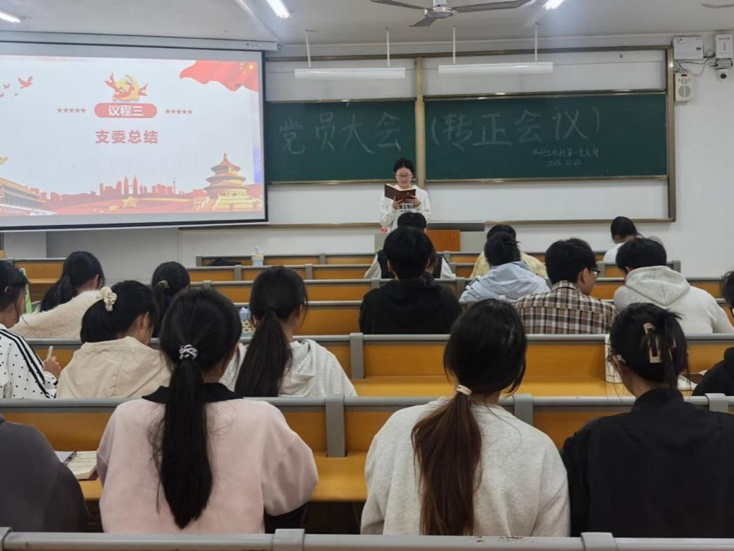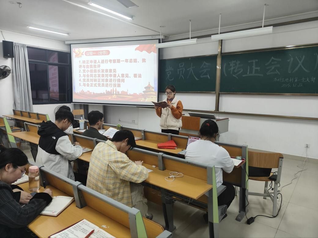 12月22日,中文成人网 本科生地科第一党支部在武鸣校区2号实验楼A-202教室顺利召开2025年12月预备党员转正会议。此次会议由党支部书记黄吉慧主持,党支部全体成员参加。